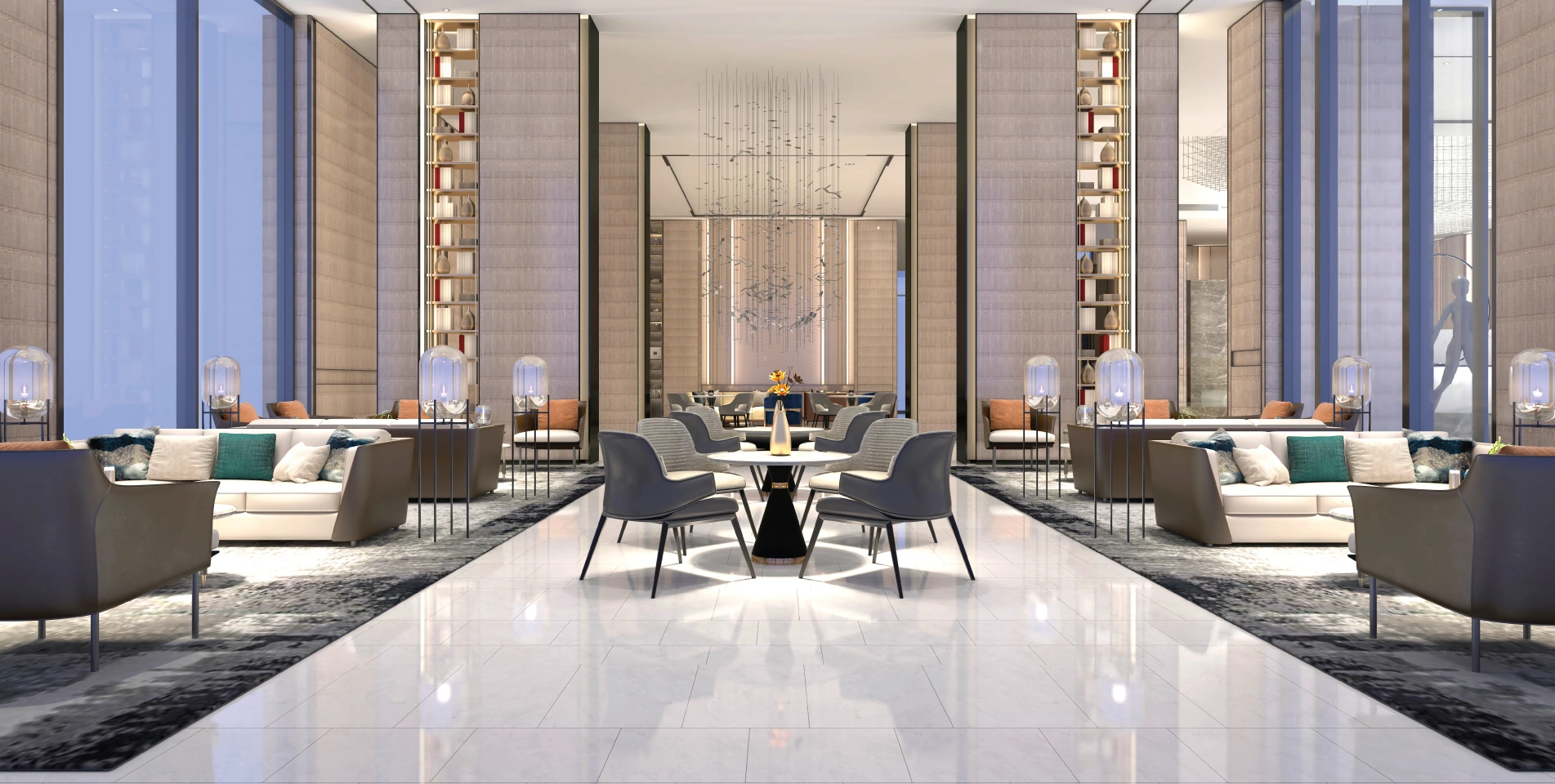 Impressive entrance plaza with dedicated drop-offs for residents, guests, and commercial access.
